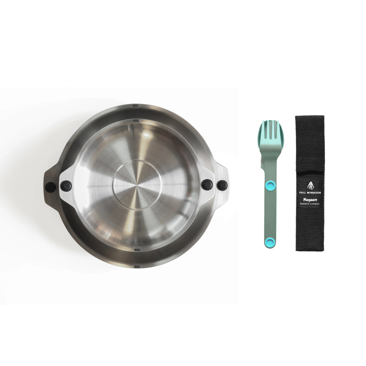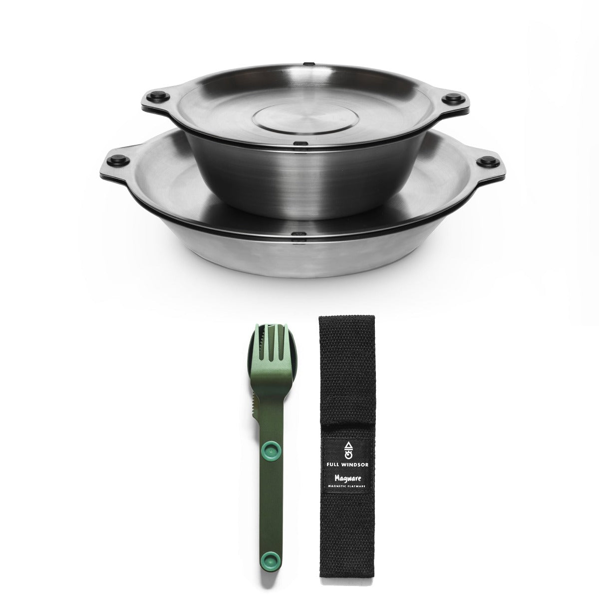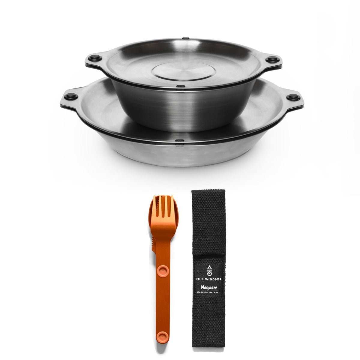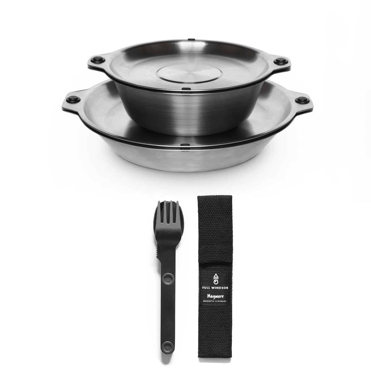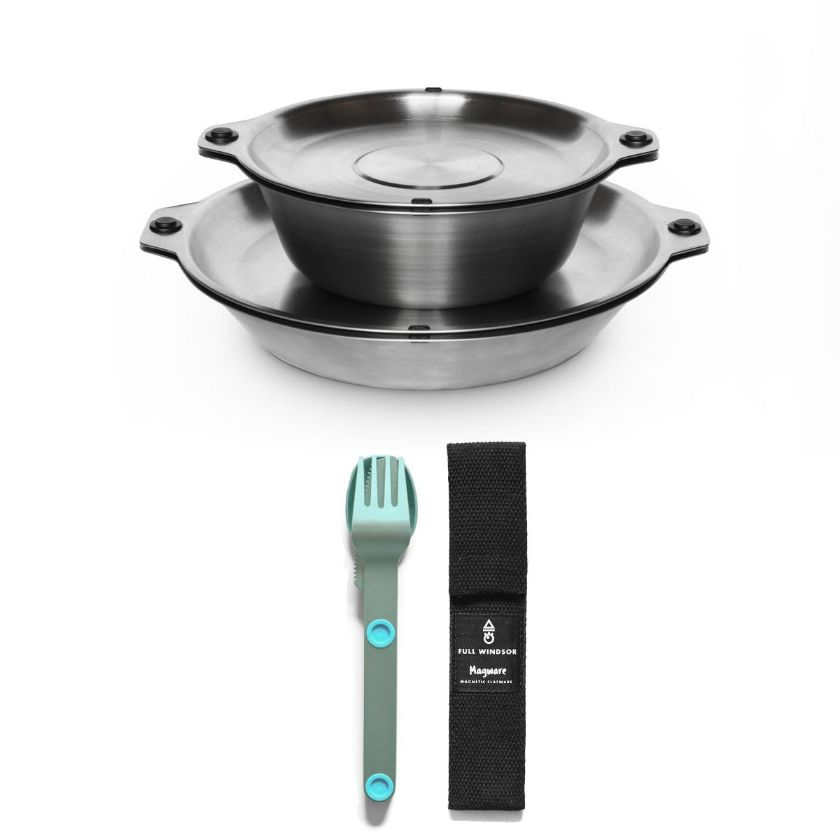Featuring our patent pending magnetic attachment points. This allows all the plates and bowls to stack magnetically together in a tidy and organized manner. The included Magware Cutlery can be attached onto the side of both bowls and plates, keeping it away from unhygienic surfaces and making it easy to carry.