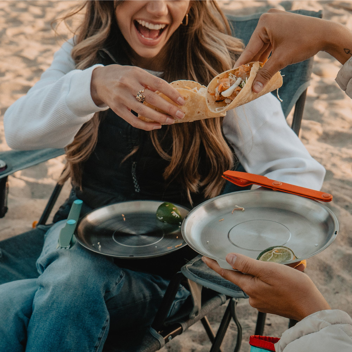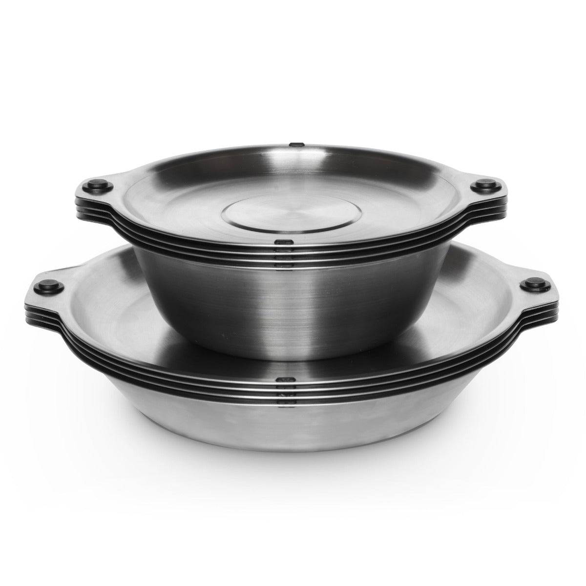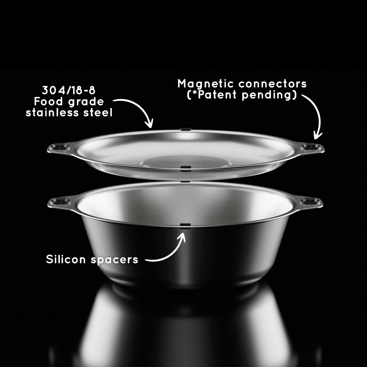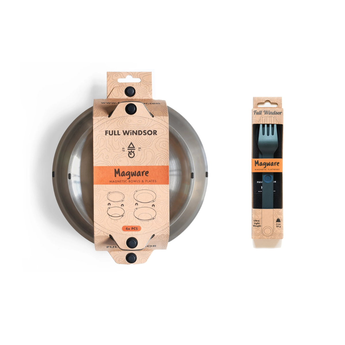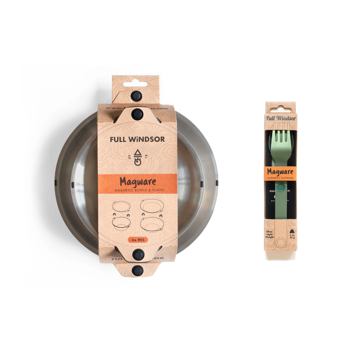 Featuring our patent pending magnetic attachment points. This allows all the plates and bowls to stack magnetically together in a tidy and organized manner. The included Magware Cutlery can be attached onto the side of both bowls and plates, keeping it away from unhygienic surfaces and making it easy to carry.