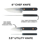 MagKnives combines two precision knives and two magnetic cutting boards in one compact prep kit designed for serious outdoor cooking. The chef’s knife handles the heavy chopping while the Japanese-style utility knife delivers fine control for slicing and detail work. Both lock magnetically to the boards for safe transport and silent storage.