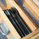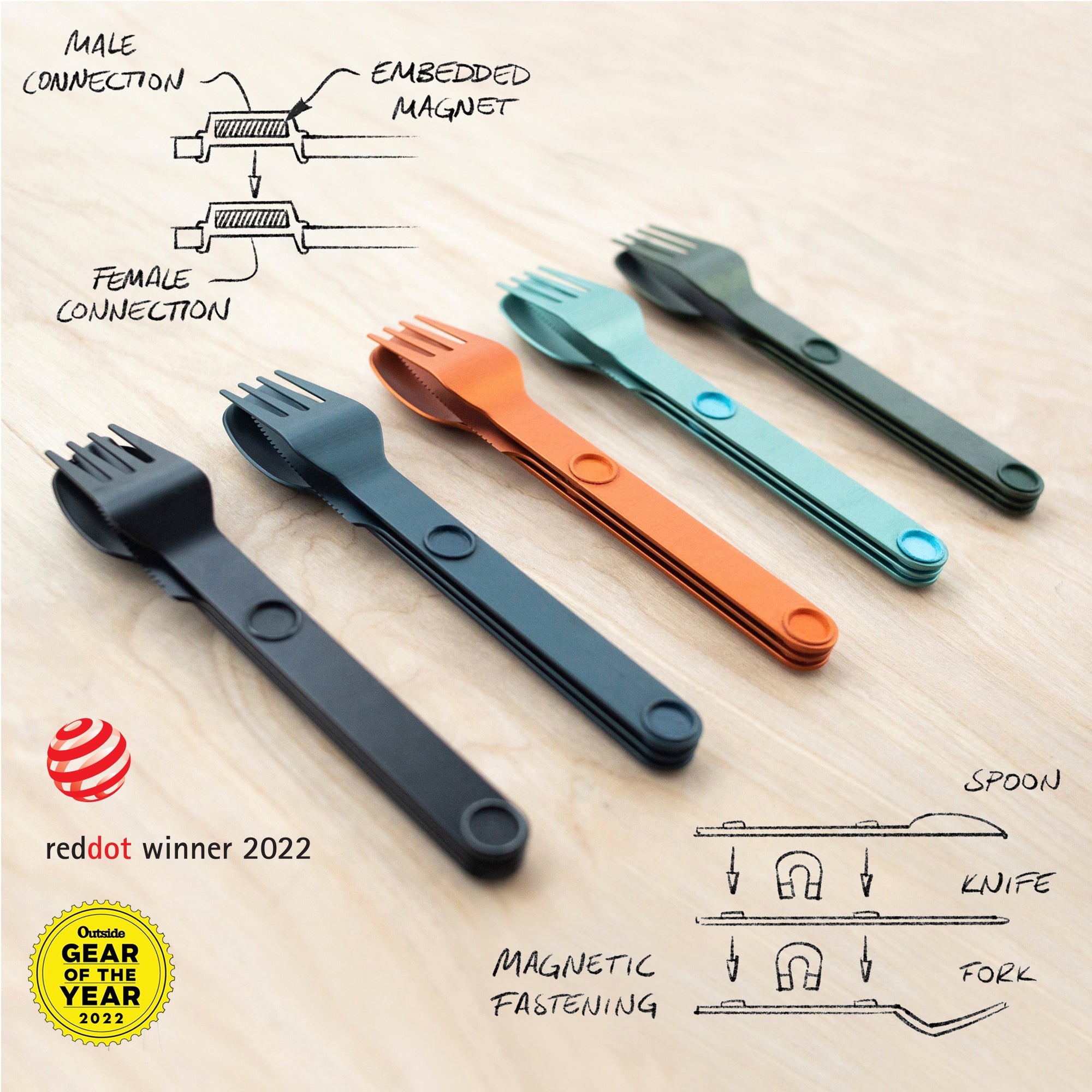 Featuring our patent-pending magnetic attachment points. This allows all the plates and bowls to stack magnetically together in a tidy and organized manner. You can stack as many sets together as you want. Our Magware Magnetic Cutlery can also be attached to the side of both bowls and plates, keeping it away from unhygienic surfaces and making it easy to carry.